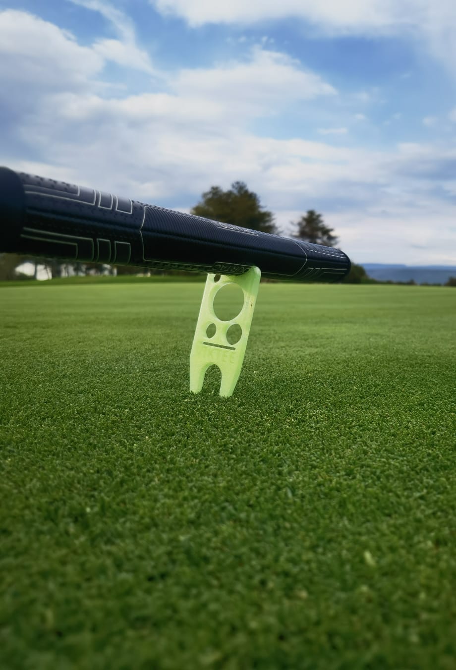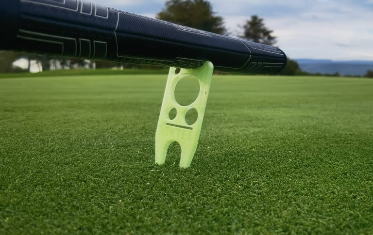 Évitez que le grip de votre putter ne soit mouillé en le posant sur notre outil à divots, pour ne pas avoir un grip humide au trou suivant.
